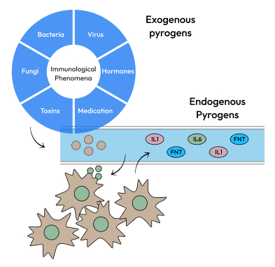 Fever is the result of a physiological process triggered by an external stimulus. Pyrogens (exogenous and endogenous) are substances which may be infectious microorganisms, toxins released by microorganisms, or pyrogenic cytokines that prompt fever.